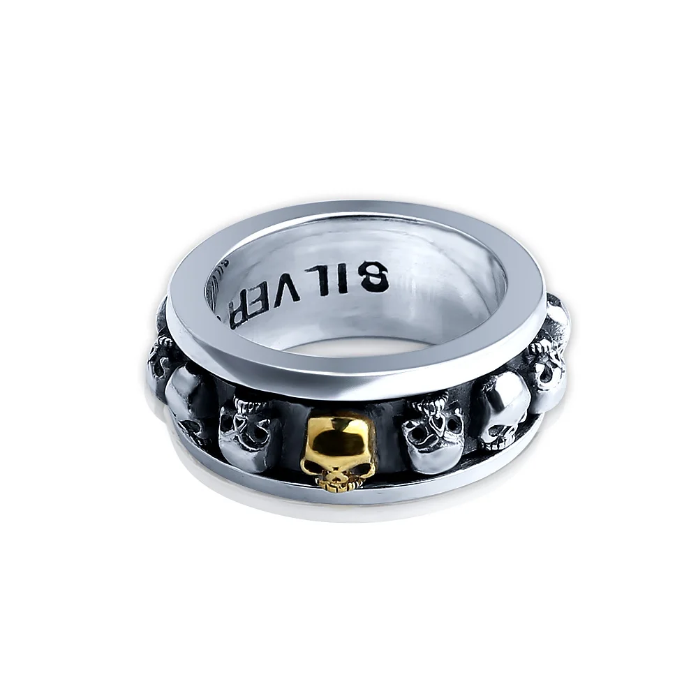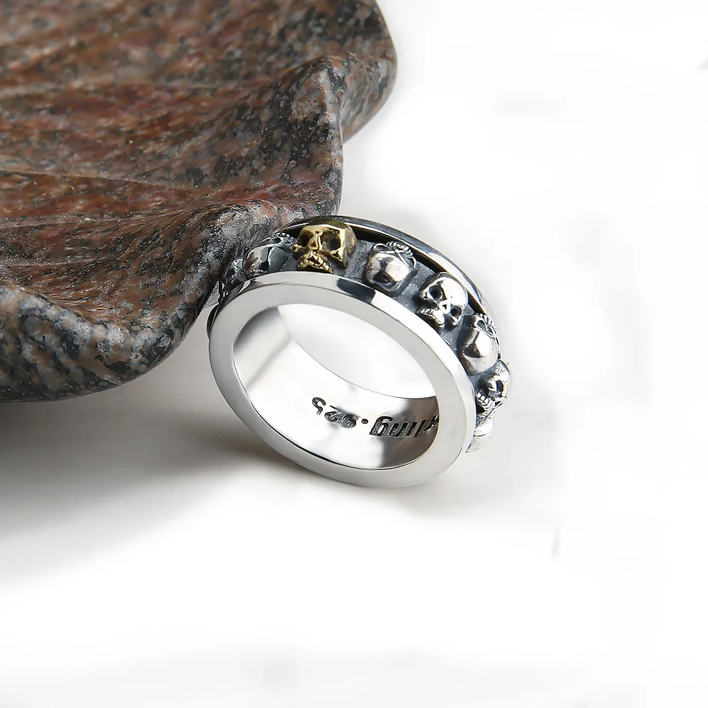 New 100% Real Pure 925 Sterling Silver Ring Punk Skull Style Rotatable Ring Thai Silver Skeleton Fi